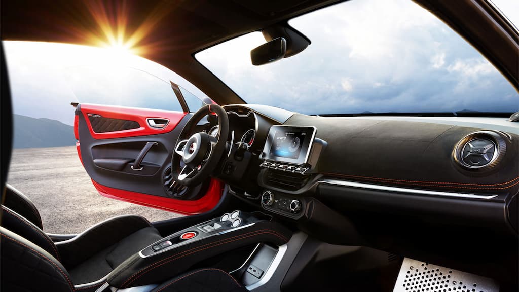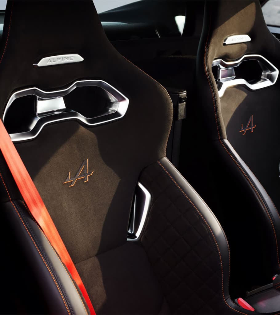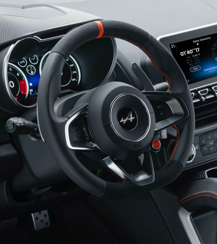 Dans l’habitacle, les surpiqûres orange, l’utilisation de Dinamica noir soulignent la personnalité affirmée de l’A110S. Le volant est gainé de cuir et de Dinamica avec un point zéro et des surpiqûres orange. Les pédales et les repose-pieds sont en aluminium ; les drapeaux en fibre de carbone et orange - identiques à ceux présents sur la carrosserie - apportent la touche finale à l’habitacle.